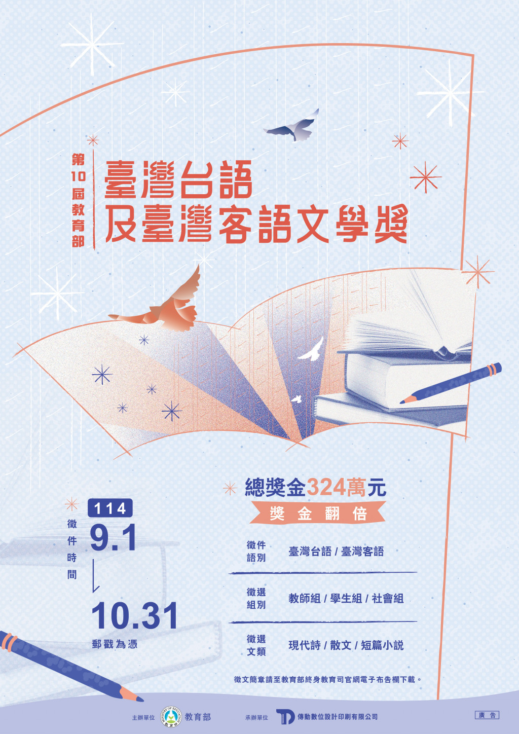 第十屆教育部臺灣台語及臺灣客語文學獎」徵文及相關事宜